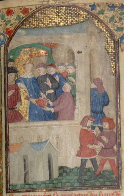 Parigi, Bibliothèque interuniversitaire Sainte-Geneviève, 1128, f. 1r. Nella sala del trono Laurent de Premierfait presenta il libro al re Carlo VI, circondato dai suoi consiglieri; all'esterno si trovano tre uomini colpiti dalla sfortuna.