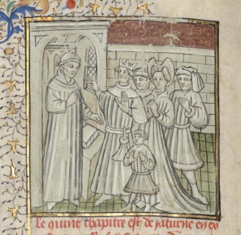 Parigi, Bibliothèque interuniversitaire Sainte-Geneviève, 1128, f. 6v. Giovanni Boccaccio si rivolge ad un gruppo di nobili.