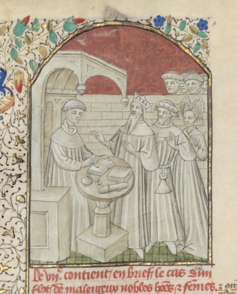 Parigi, Bibliothèque interuniversitaire Sainte-Geneviève, 1128, f. 10v. Giovanni Boccaccio conversa con tre personaggi colpiti dalla sfortuna; alcuni spettatori osservano la scena.