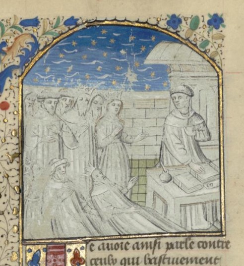 Parigi, Bibliothèque interuniversitaire Sainte-Geneviève, 1128, f. 19v. Giovanni Boccaccio si rivolge ad un gruppo di re e regine.