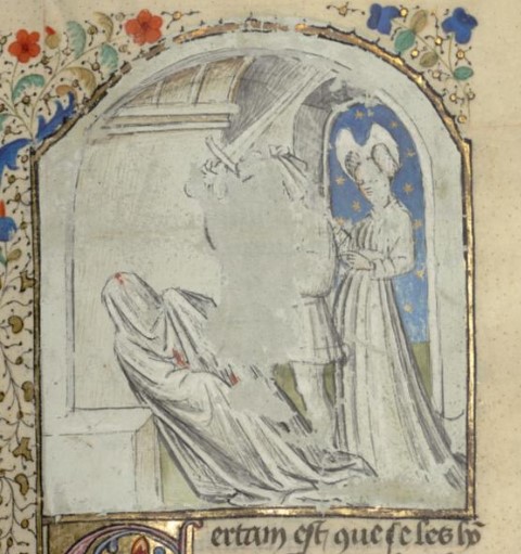 Parigi, Bibliothèque interuniversitaire Sainte-Geneviève, 1128, f. 28r. Egisto uccide Agamennone, avvolto nel mantello, con l'aiuto di Clitennestra.