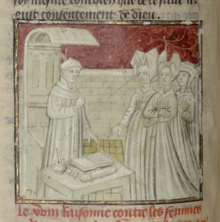 Parigi, Bibliothèque interuniversitaire Sainte-Geneviève, 1128, f. 32v. Giovanni Boccaccio incontra alcune dame.