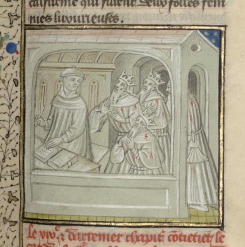 Parigi, Bibliothèque interuniversitaire Sainte-Geneviève, 1128, f. 36r. Giovanni Boccaccio incontra quattro re coperti di ferite.