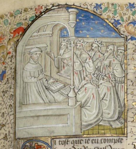 Parigi, Bibliothèque interuniversitaire Sainte-Geneviève, 1128, f. 41r. Giovanni Boccaccio incontra alcuni sovrani coperti di ferite.
