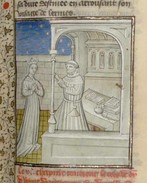 Parigi, Bibliothèque interuniversitaire Sainte-Geneviève, 1128, f. 48r. La regina Didone appare a Giovanni Boccaccio.