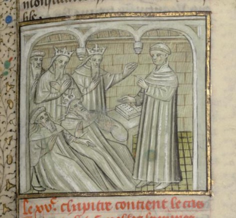Parigi, Bibliothèque interuniversitaire Sainte-Geneviève, 1128, f. 64r. Giovanni Boccaccio incontra un gruppo di sfortunati.