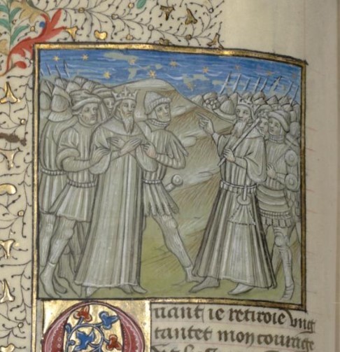 Parigi, Bibliothèque interuniversitaire Sainte-Geneviève, 1128, f. 66v. Ciro viene condotto prigioniero di fronte a Tamiri.