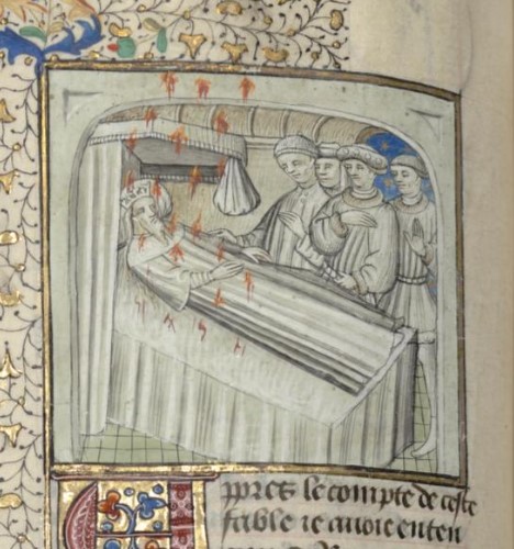 Parigi, Bibliothèque interuniversitaire Sainte-Geneviève, 1128, f. 74v. Tullo Ostilio, disteso sul letto, viene colpito dal fulmine divino.