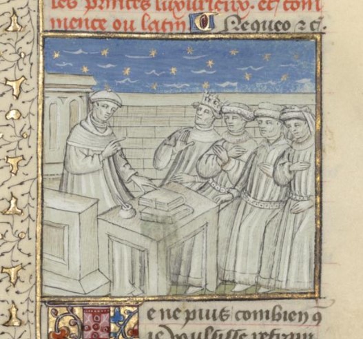 Parigi, Bibliothèque interuniversitaire Sainte-Geneviève, 1128, f. 80r. Giovanni Boccaccio incontra un gruppo di sfortunati.