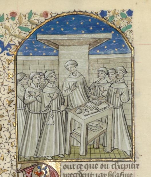Parigi, Bibliothèque interuniversitaire Sainte-Geneviève, 1128, f. 106v. Giovanni Boccaccio incontra un gruppo di scrivani.