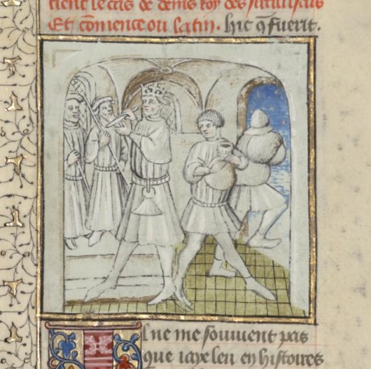Parigi, Bibliothèque interuniversitaire Sainte-Geneviève, 1128, f. 121r. Dionigi di Siracusa ordina ai suoi uomini di spogliare le statue del tempio dei loro tesori.