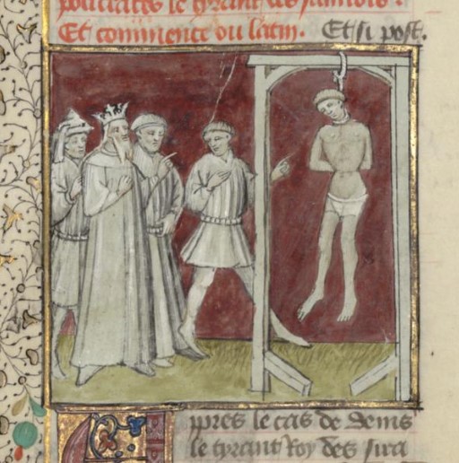 Parigi, Bibliothèque interuniversitaire Sainte-Geneviève, 1128, f. 123v. Oronte fa impiccare Policrate, tiranno di Samo.