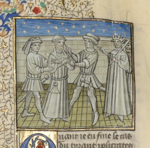 Parigi, Bibliothèque interuniversitaire Sainte-Geneviève, 1128, f. 125r. Due uomini accecano Callistene con un ferro rovente per ordine di Alessandro Magno.