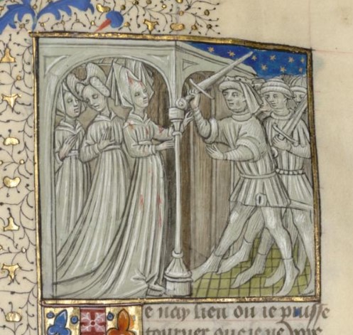 Parigi, Bibliothèque interuniversitaire Sainte-Geneviève, 1128, f. 137r. Olimpiade, madre di Alessandro Magno, viene assassinata dai sicari.