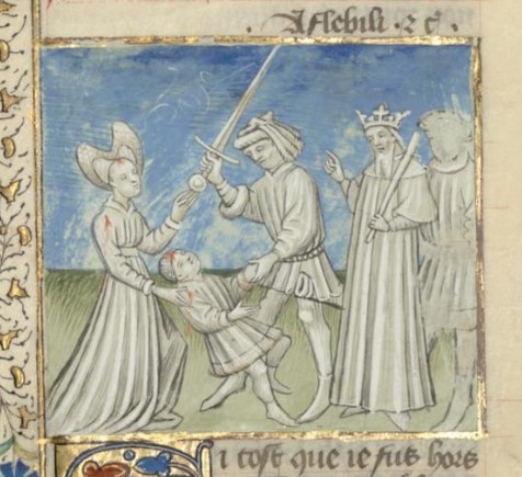 Parigi, Bibliothèque interuniversitaire Sainte-Geneviève, 1128, f. 143v. Cassandro fa assassinare Barsine e suo figlio Eracle.