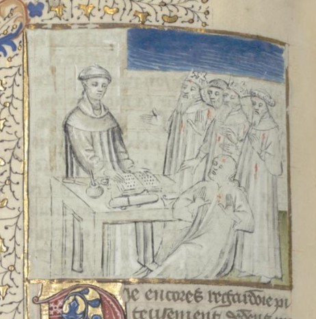 Parigi, Bibliothèque interuniversitaire Sainte-Geneviève, 1128, f. 149v. Giovanni Boccaccio incontra un gruppo di sfortunati coperti di ferite.