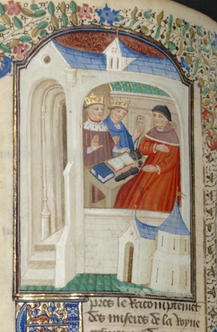Parigi, Bibliothèque interuniversitaire Sainte-Geneviève, 1128, f. 158v. Seleuco e Antioco compaiono nello studio di Giovanni Boccaccio.