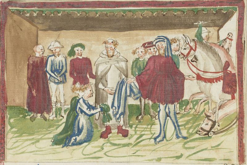 Parigi, Bibliothèque Nationale de France, It. 63, f. 29v. Il copista del manoscritto, datato 10 ottobre 1427, è Ludovico di Salvestro Ceffini. Una donna, essendo stata aggredita sulla strada, ottiene udienza dal re di Cipro per chiedere giustizia.