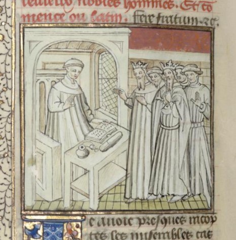 Parigi, Bibliothèque interuniversitaire Sainte-Geneviève, 1128, f. 160v. Giovanni Boccaccio incontra un gruppo di sfortunati.