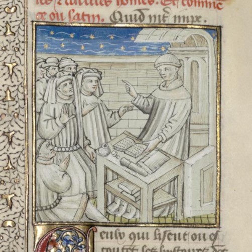 Parigi, Bibliothèque interuniversitaire Sainte-Geneviève, 1128, f. 165r. Giovanni Boccaccio incontra un gruppo di sfortunati.