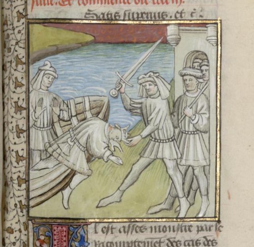 Parigi, Bibliothèque interuniversitaire Sainte-Geneviève, 1128, f. 189r. Demetrio viene decapitato appena giunto sulle coste di Tiro.