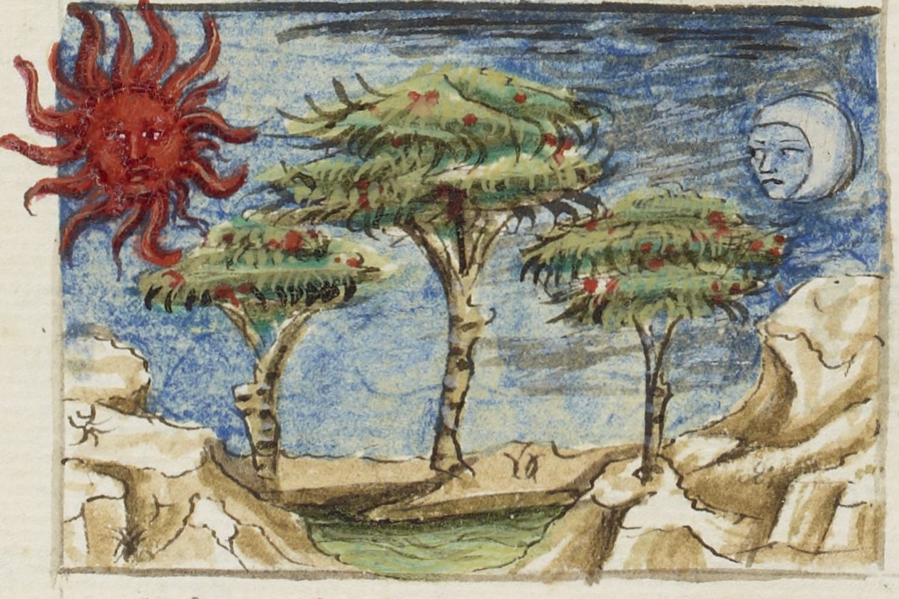 Parigi, Bibliothèque Nationale de France, It. 63, f. 33v. Il copista del manoscritto, datato 10 ottobre 1427, è Ludovico di Salvestro Ceffini. Il Giorno e la Notte, simboleggiati dal sole e dalla luna, trascorrono su di un pesaggio.
