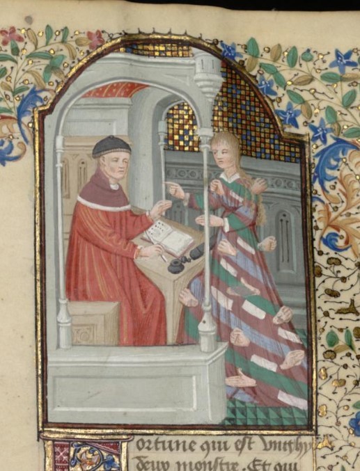 Parigi, Bibliothèque interuniversitaire Sainte-Geneviève, 1128, f. 196r. La Fortuna, una dama con molte mani, appare dinanzi a Giovanni Boccaccio.
