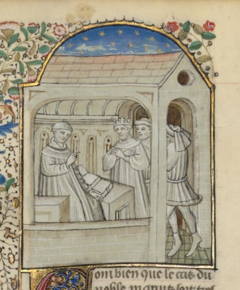 Parigi, Bibliothèque interuniversitaire Sainte-Geneviève, 1128, f. 205v. Giovanni Boccaccio incontra un gruppo di sfortunati.