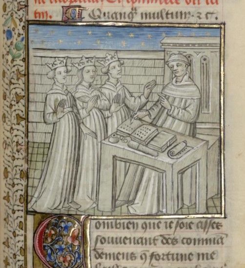 Parigi, Bibliothèque interuniversitaire Sainte-Geneviève, 1128, f. 206r. Giovanni Boccaccio incontra Cleopatra IV, Cleopatra Tea e Cleopatra Euridice.