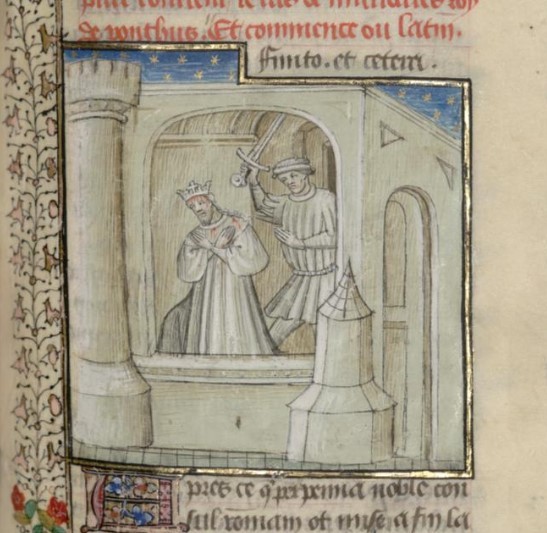 Parigi, Bibliothèque interuniversitaire Sainte-Geneviève, 1128, f. 207r. Mitridate, re del Ponto, si fa uccidere da un generale dei Galli.