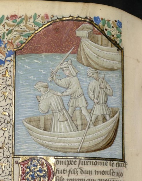 Parigi, Bibliothèque interuniversitaire Sainte-Geneviève, 1128, f. 215v. Due soldati di Tolomeo decapitano Pompeo su una nave.