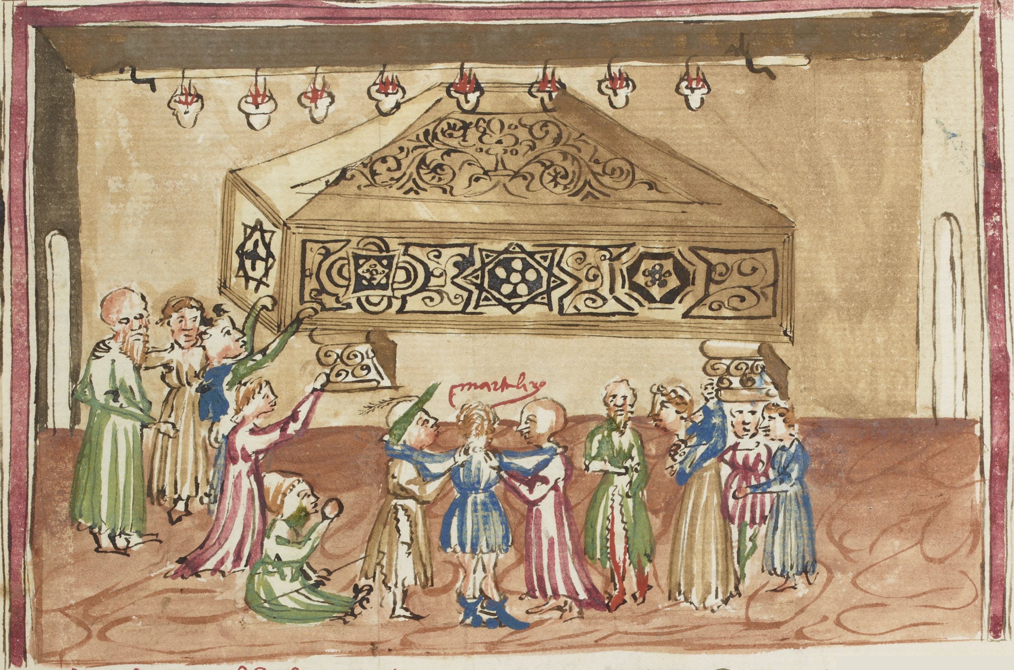 Parigi, Bibliothèque Nationale de France, It. 63, f. 34r. Il copista del manoscritto, datato 10 ottobre 1427, è Ludovico di Salvestro Ceffini. Martellino, fingendosi paralitico, sorretto da due amici si fa strada tra la folla degli afflitti, per giungere dinanzi all'arca dove giace la salma di Sant'Arrigo.