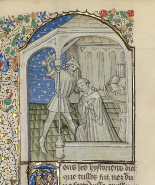 Parigi, Bibliothèque interuniversitaire Sainte-Geneviève, 1128, f. 227v. Cicerone viene decapitato da un sicario nel suo studio.