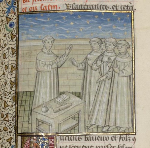 Parigi, Bibliothèque interuniversitaire Sainte-Geneviève, 1128, f. 231r. Giovanni Boccaccio incontra un gruppo di scrivani.