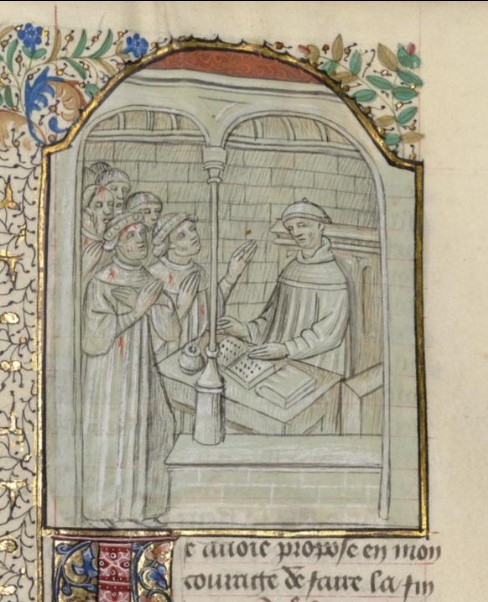 Parigi, Bibliothèque interuniversitaire Sainte-Geneviève, 1128, f. 233r. Giovanni Boccaccio incontra un gruppo di sfortunati coperti di ferite.