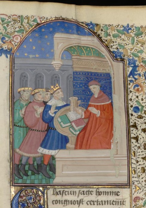Parigi, Bibliothèque interuniversitaire Sainte-Geneviève, 1128, f. 238r. Giovanni Boccaccio incontra un gruppo di sfortunati.