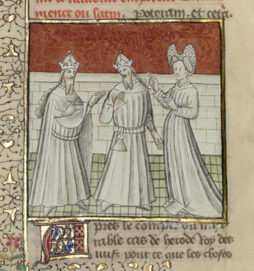 Parigi, Bibliothèque interuniversitaire Sainte-Geneviève, 1128, f. 244r. Messalina si rivolge a Caligola e Tiberio.