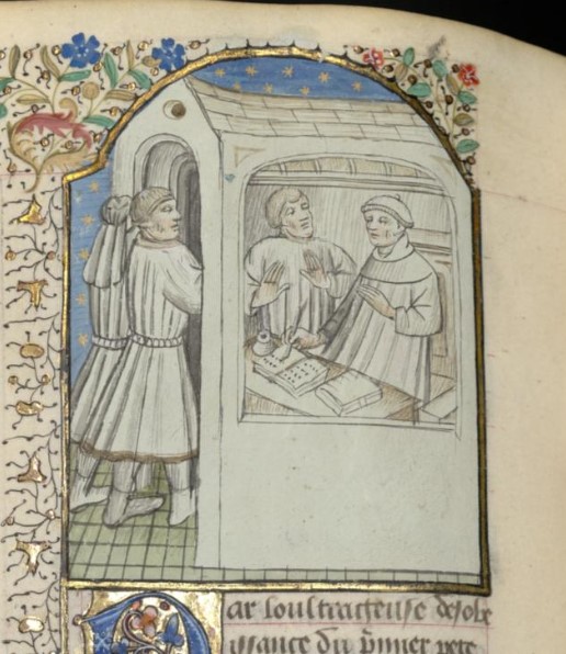 Parigi, Bibliothèque interuniversitaire Sainte-Geneviève, 1128, f. 260v. Giovanni Boccaccio incontra un gruppo di sfortunati.
