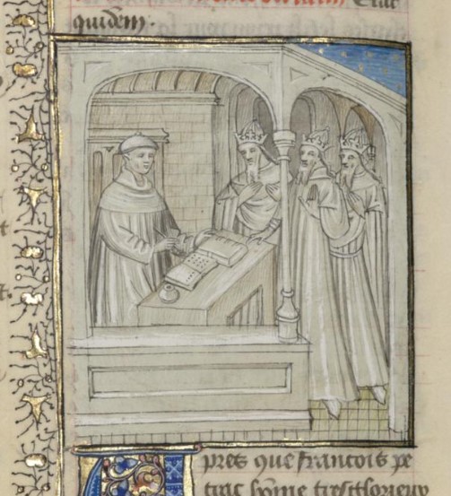 Parigi, Bibliothèque interuniversitaire Sainte-Geneviève, 1128, f. 271v. Giovanni Boccaccio incontra tre sovrani sfortunati.