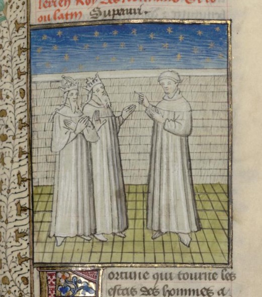 Parigi, Bibliothèque interuniversitaire Sainte-Geneviève, 1128, f. 276r. Giovanni Boccaccio incontra i re Sapore e Valeriano.