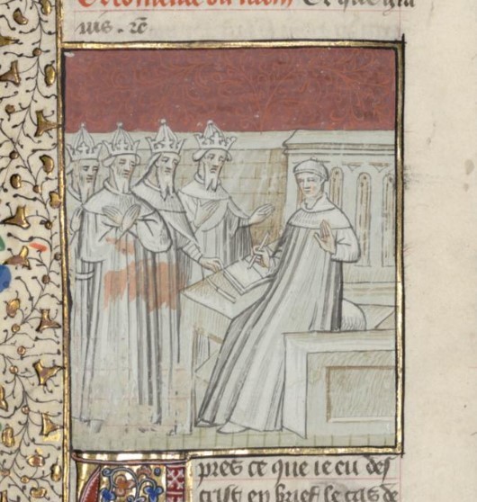 Parigi, Bibliothèque interuniversitaire Sainte-Geneviève, 1128, f. 278v. Giovanni Boccaccio incontra quattro imperatori.
