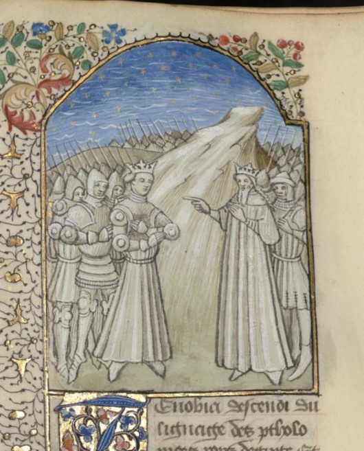 Parigi, Bibliothèque interuniversitaire Sainte-Geneviève, 1128, f. 280r. Zenobia, regina di Palmira, si arrende all'imperatore Aureliano.