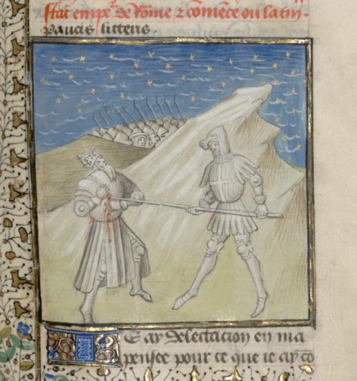 Parigi, Bibliothèque interuniversitaire Sainte-Geneviève, 1128, f. 289r. Giuliano l'Apostata viene trafitto da Mercurio.