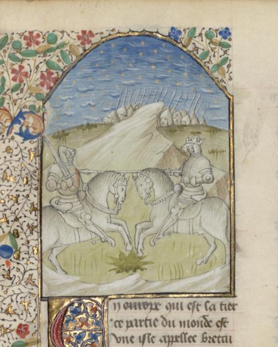 Parigi, Bibliothèque interuniversitaire Sainte-Geneviève, 1128, f. 304v. Re Artù uccide Mordred in battaglia.