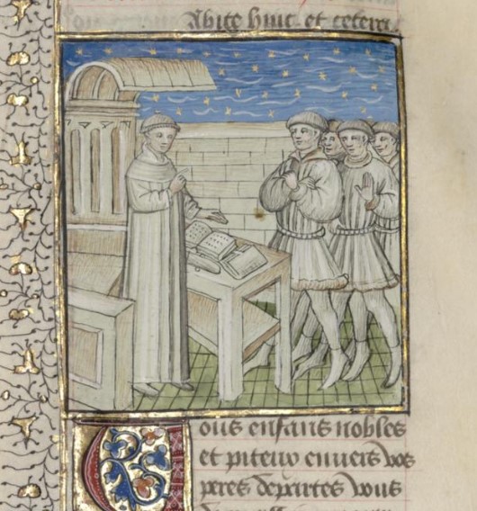 Parigi, Bibliothèque interuniversitaire Sainte-Geneviève, 1128, f. 307r. Giovanni Boccaccio incontra un gruppo di sfortunati.