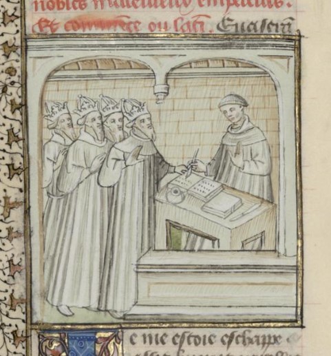 Parigi, Bibliothèque interuniversitaire Sainte-Geneviève, 1128, f. 319r. Giovanni Boccaccio incontra quattro imperatori.