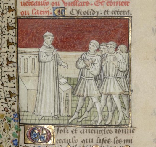 Parigi, Bibliothèque interuniversitaire Sainte-Geneviève, 1128, f. 333r. Giovanni Boccaccio incontra un gruppo di sfortunati.