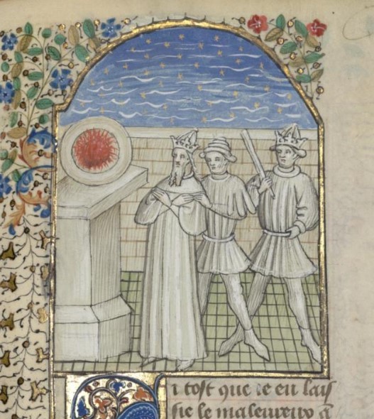 Parigi, Bibliothèque interuniversitaire Sainte-Geneviève, 1128, f. 334r. L'imperatore Isacco Angelo viene accecato per mezzo di un braciere ardente.
