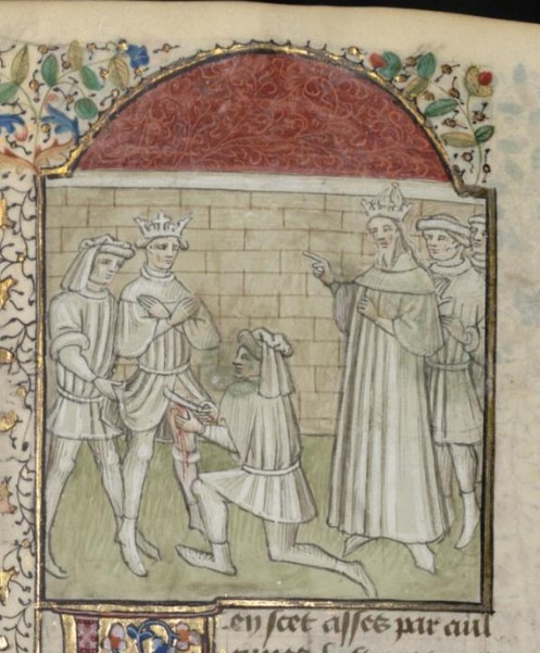 Parigi, Bibliothèque interuniversitaire Sainte-Geneviève, 1128, f. 334v. Guglielmo III, re di Sicilia, viene accecato e castrato.