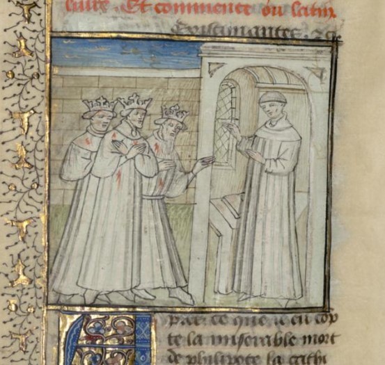 Parigi, Bibliothèque interuniversitaire Sainte-Geneviève, 1128, f. 354v. Giovanni Boccaccio incontra tre sovrani sfortunati coperti di ferite.